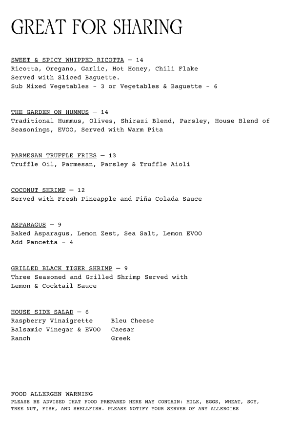 Overall, the menu supports a dining experience where the focus is on good company, quality ingredients, and moments that feel both simple and thoughtfully prepared.